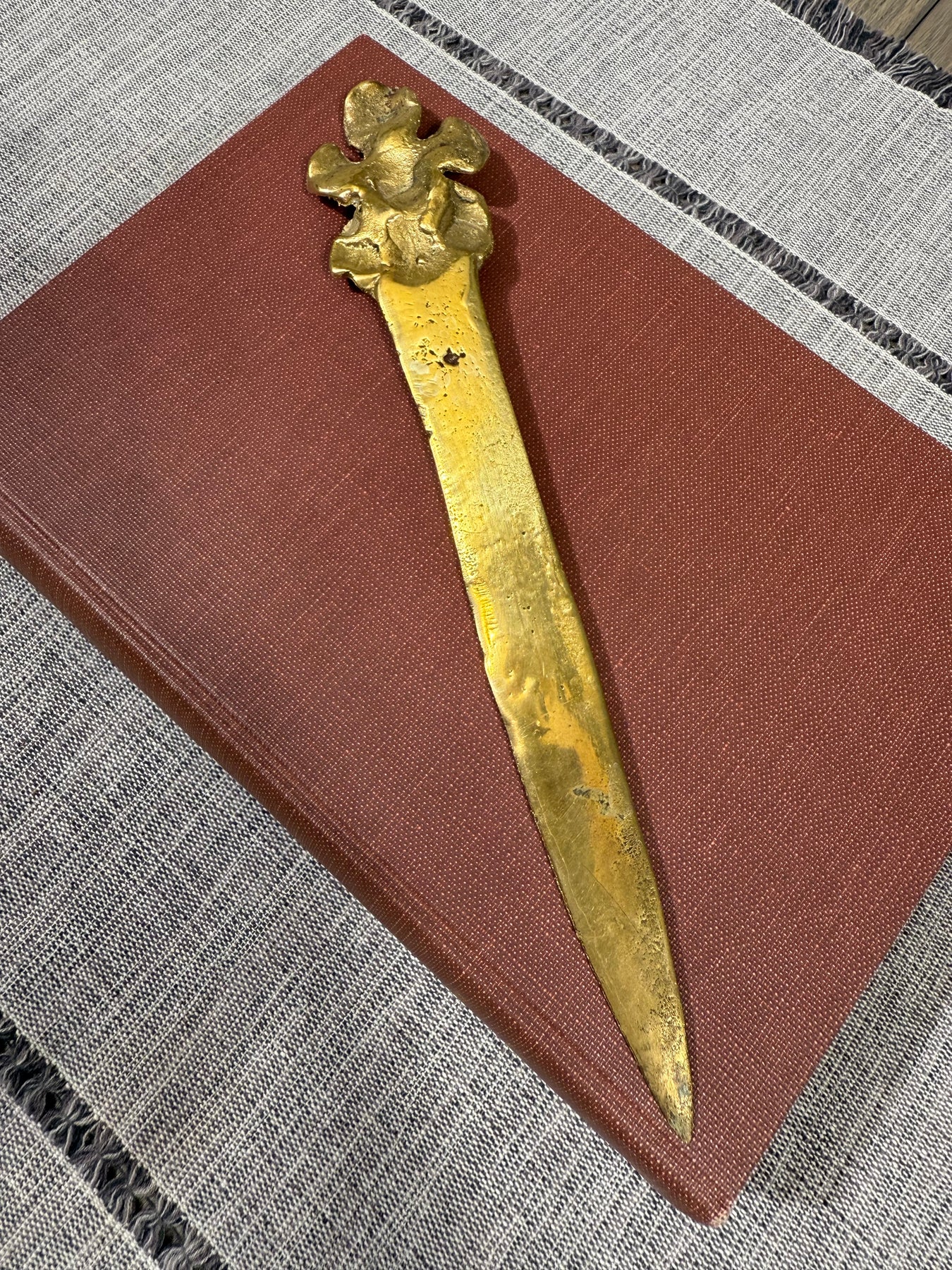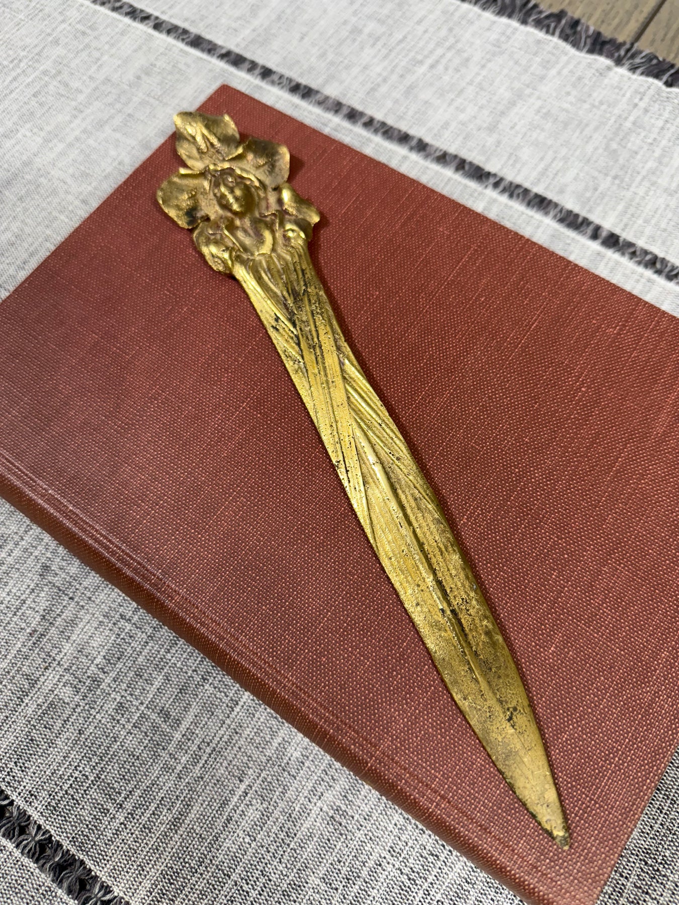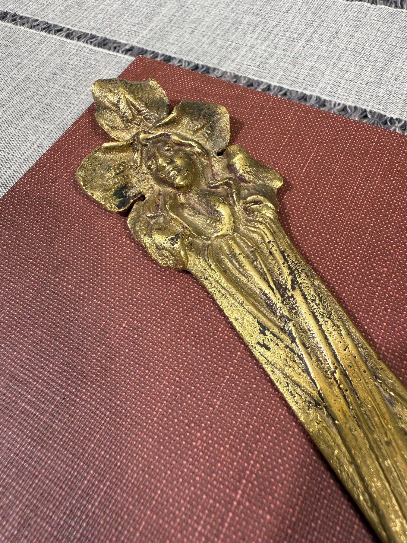 Intricately cast with fine detailing, the letter opener showcases the sinuous curves and organic forms characteristic of the late 19th and early 20th centuries. The brass construction has developed a warm patina over time, enhancing its antique charm. Whether used as a functional desk accessory or a collectible display piece, this Art Nouveau letter opener is a stunning example of period craftsmanship and artistic refinement. Measures approximately 10” long.