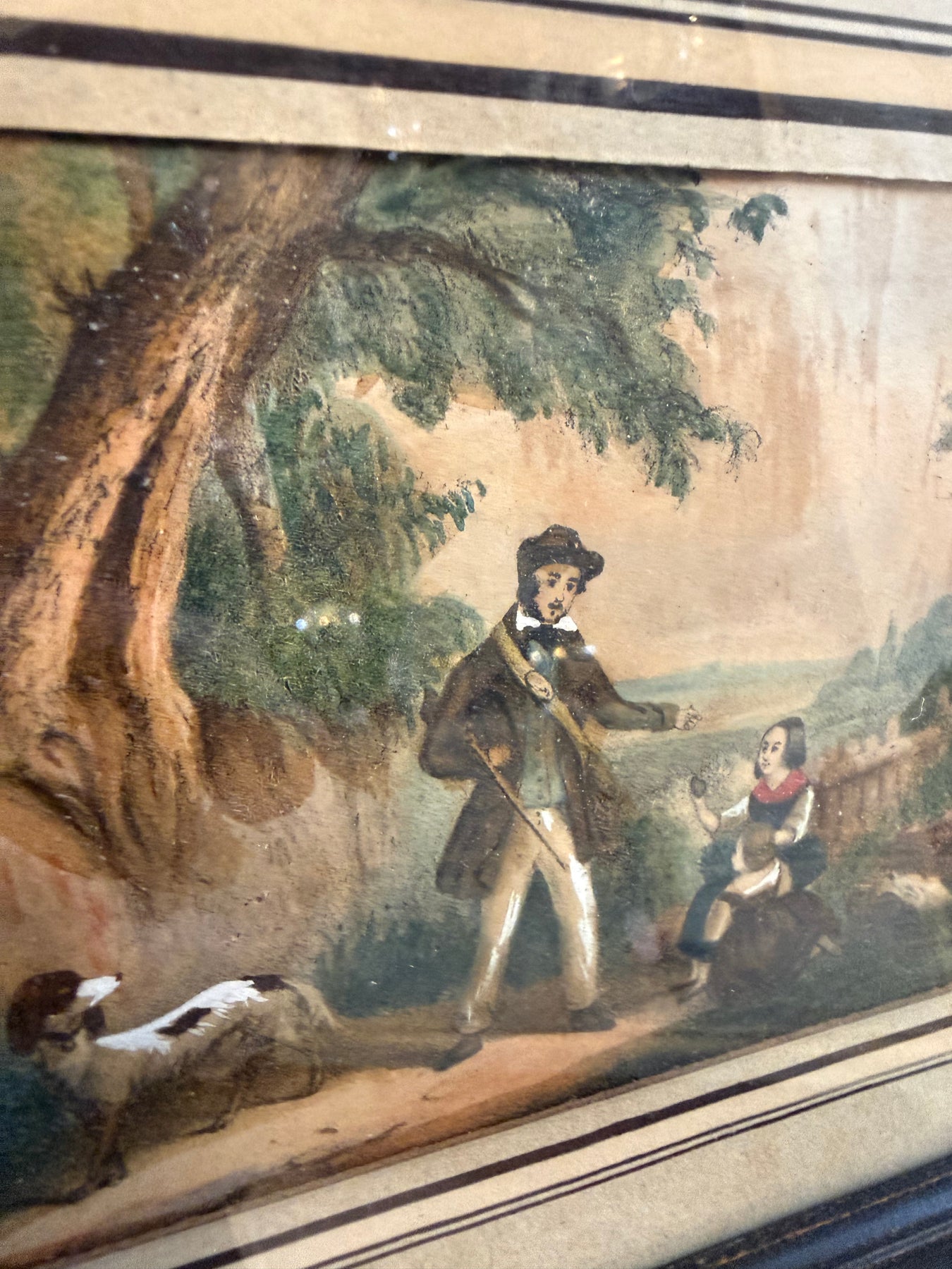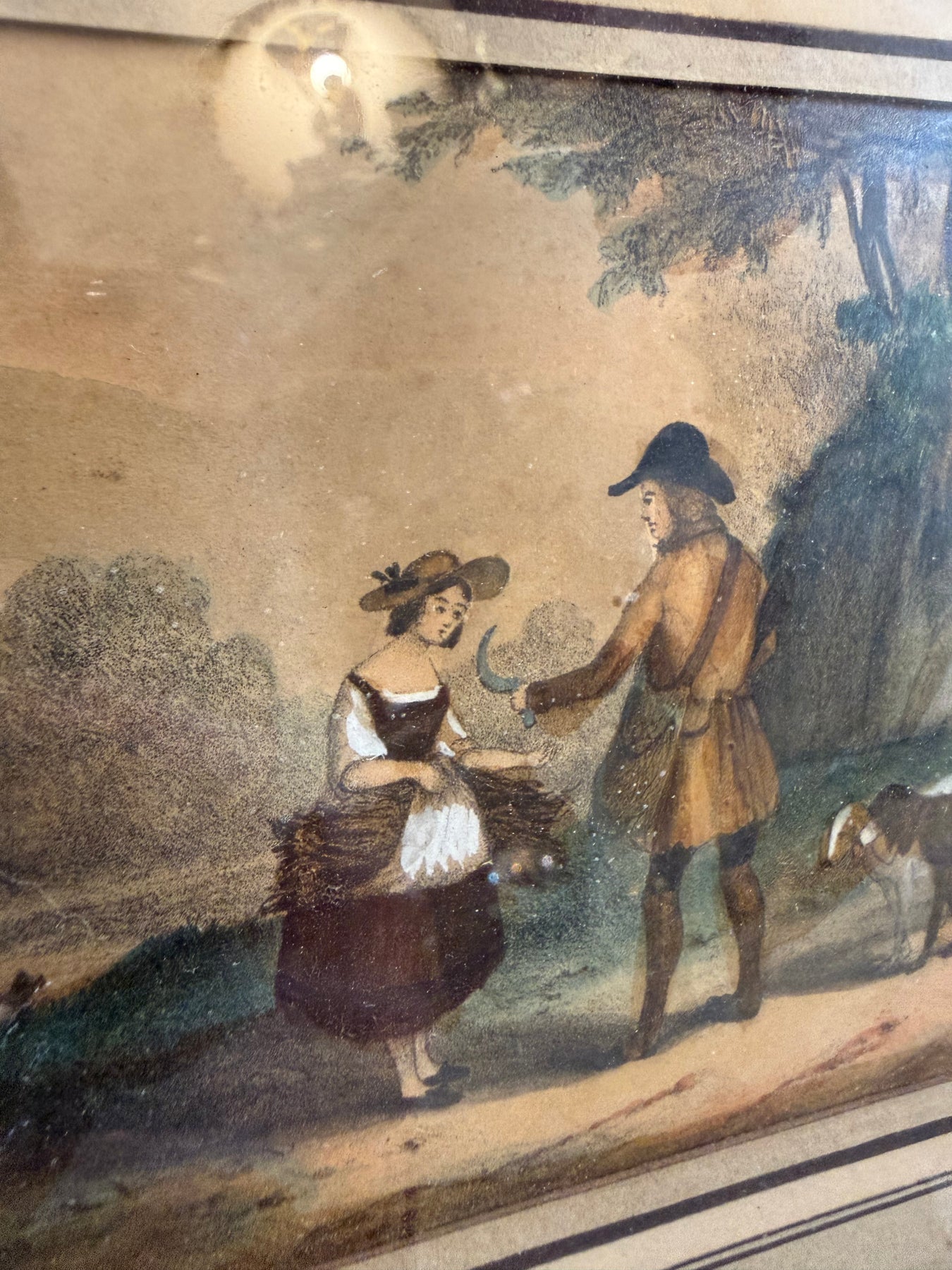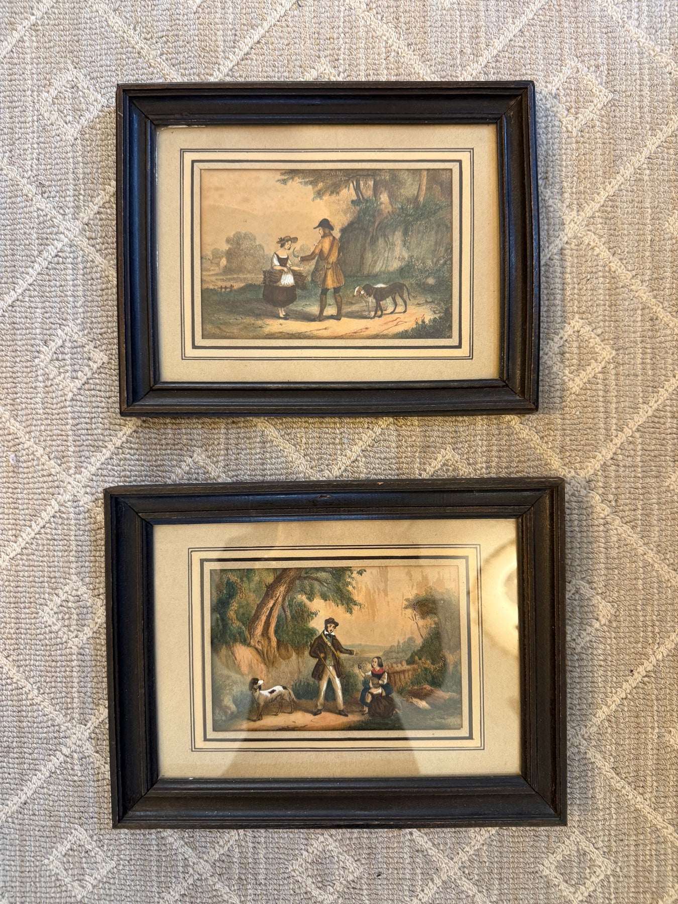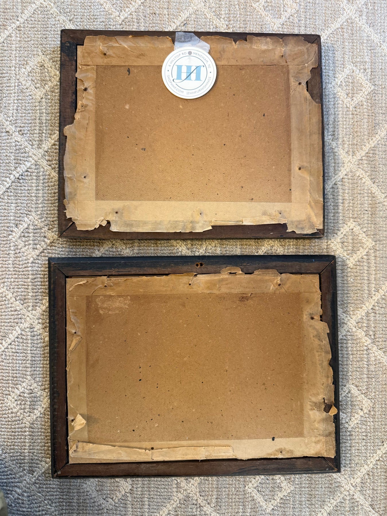The two works are closely related in scale and composition, measuring approximately 10.5 x 8 inches and 9.5 x 7.5 inches overall, and are offered together as a cohesive decorative pair. Their intimate size and lyrical subject matter make them ideal for layering into a collected wall, styling on a shelf, or incorporating into a traditional or European-inspired interior. Whether placed in a study, bedroom, or sitting room, they bring a quiet elegance and narrative charm that reflects the enduring appeal of pastoral scenes in classic design.