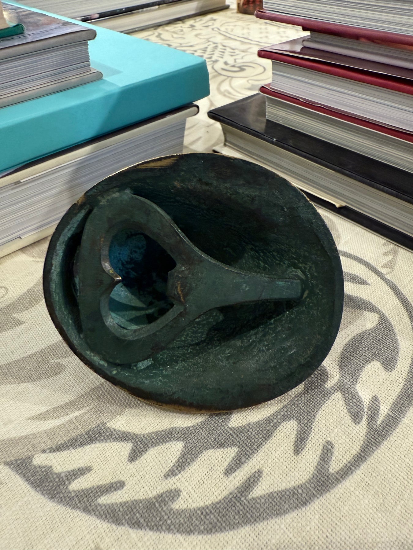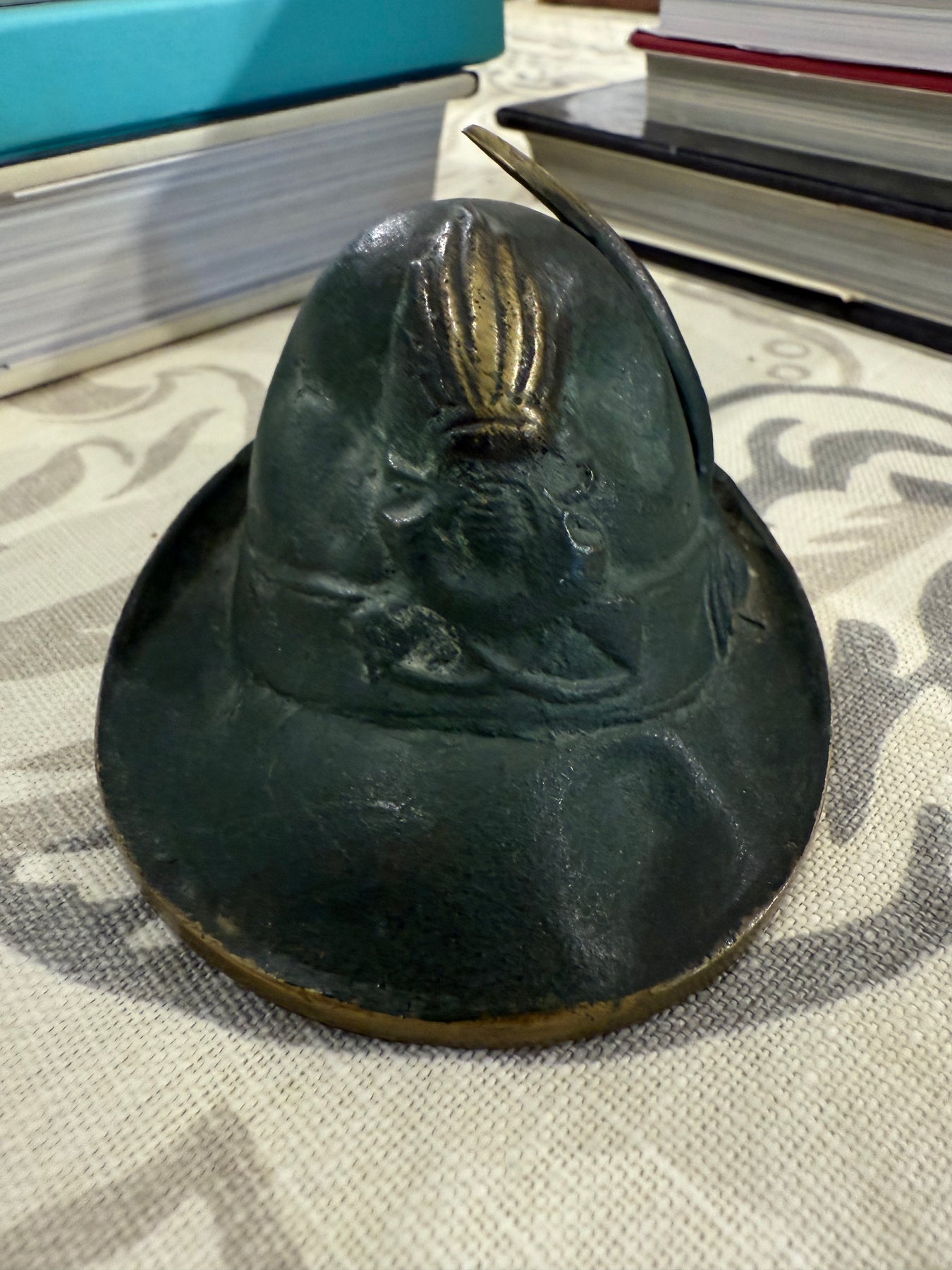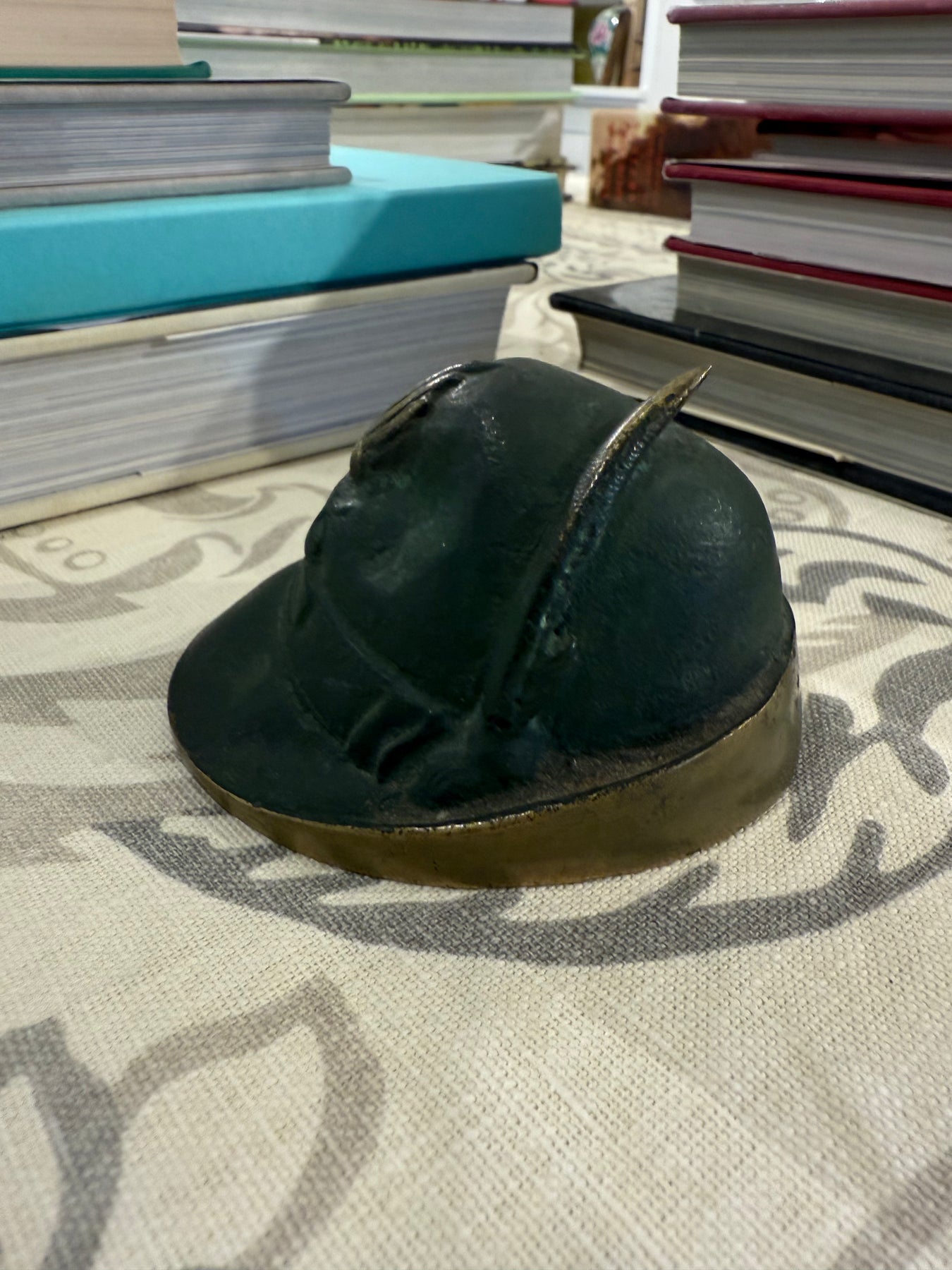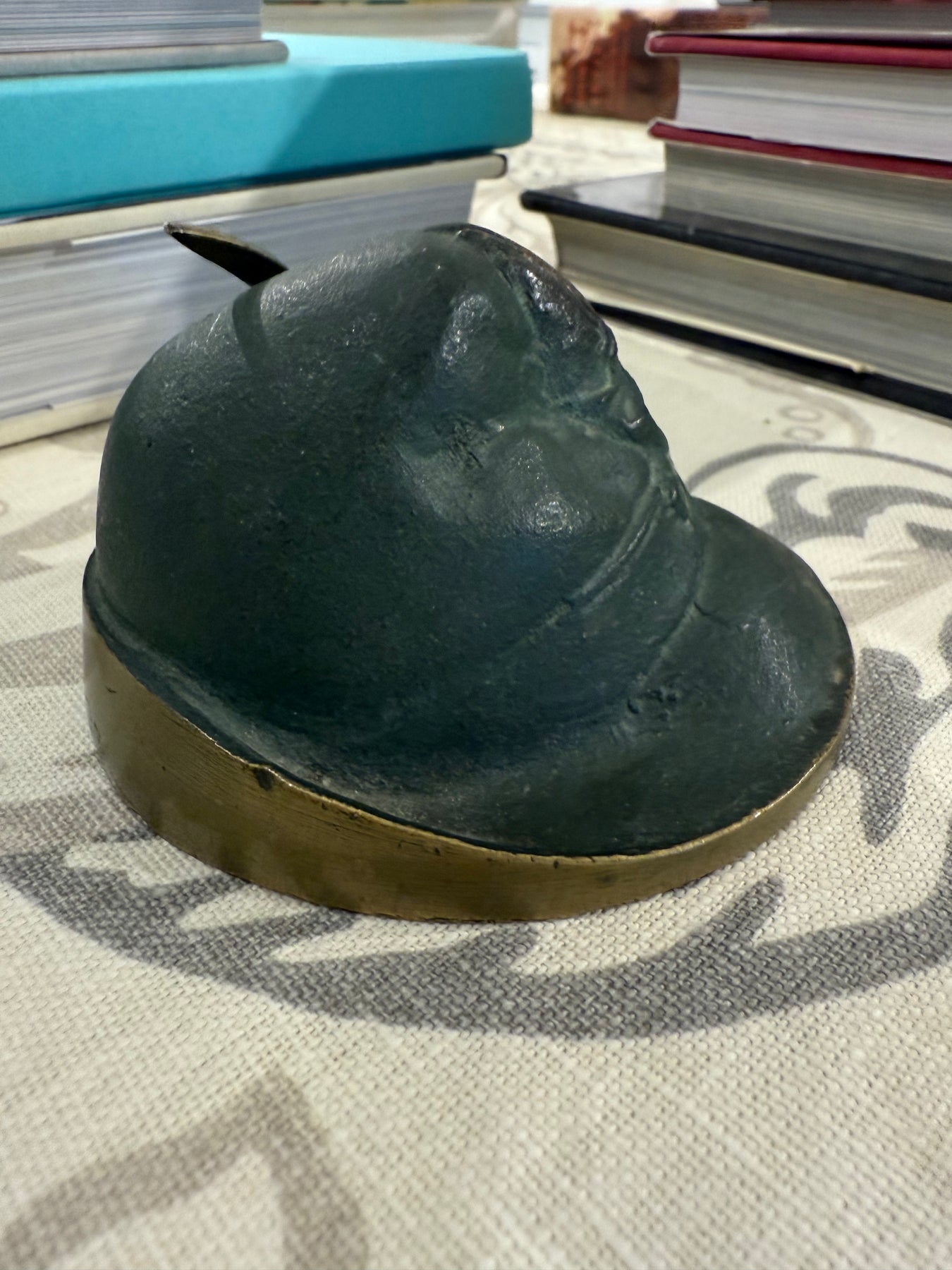A finely cast novelty bottle opener in the form of a French Adrian helmet, crafted in heavy solid brass with a rich green patinated finish. The helmet is detailed with the classic flaming grenade insignia, a symbol of the French infantry, and features the distinctive raised crest across the crown. Both functional and decorative, the underside reveals its clever design as a bottle opener, while the substantial weight allows it to serve equally well as a paperweight or desk ornament. Measures 3.5” W x 3” D x 2” H.