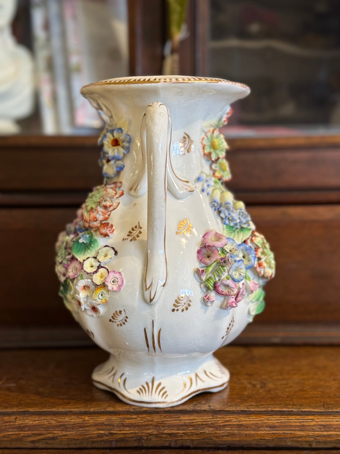 This antique German porcelain vase, crafted in the Dresden tradition around the turn of the 20th century, is richly adorned with a profusion of hand-applied porcelain flowers that cascade across the surface in a vibrant garden bouquet. Each blossom was individually modeled in porcelain and carefully attached by hand before firing, creating the delicate three-dimensional floral encrustation for which Dresden and the surrounding Thuringian porcelain workshops became famous. The elegant double-handled form is accented with soft gilded details and a gently flared rim, and the piece retains its original pierced porcelain lid crowned with a sculpted floral finial. Originally designed as a covered potpourri vase, the pierced lid allowed fragrant flowers or herbs to perfume a room while the elaborate floral decoration echoed the romantic garden aesthetic popular in European decorative arts at the turn of the century. Measuring approximately 10 inches high with the lid (8.25 inches without) and about 5 inches wide, this charming example displays beautifully as a decorative accent, whether used with fresh flowers as shown or presented as a complete covered urn.