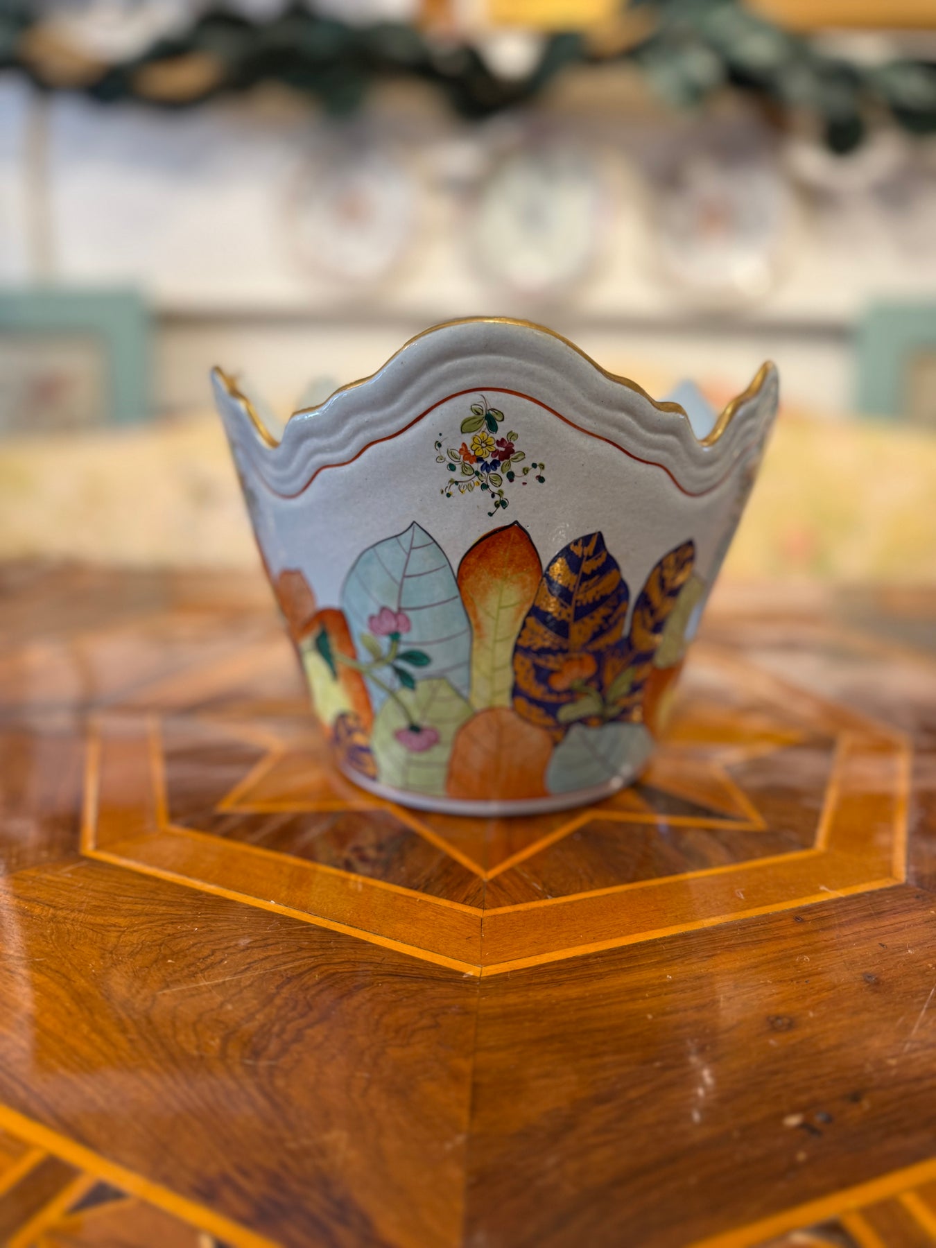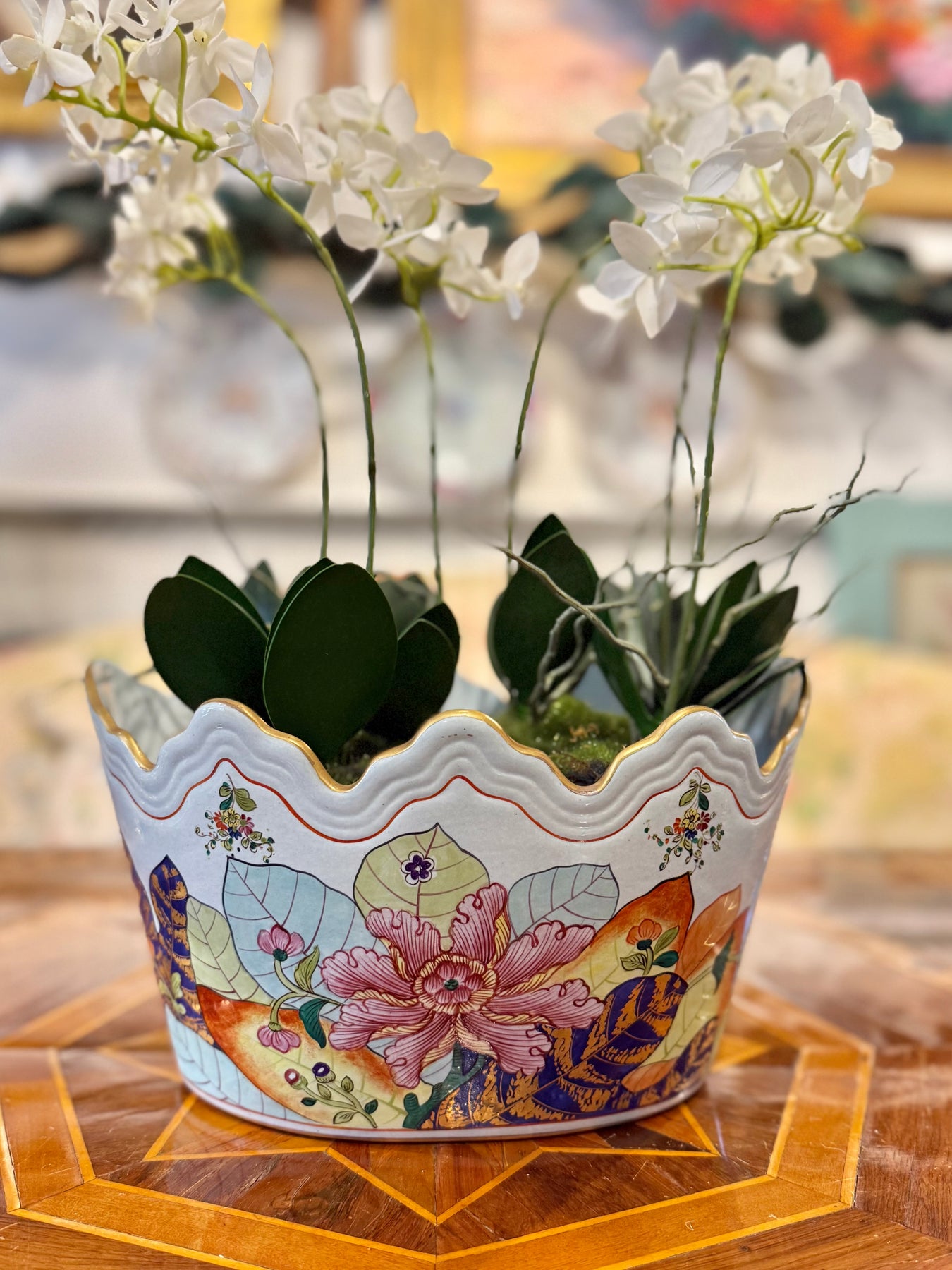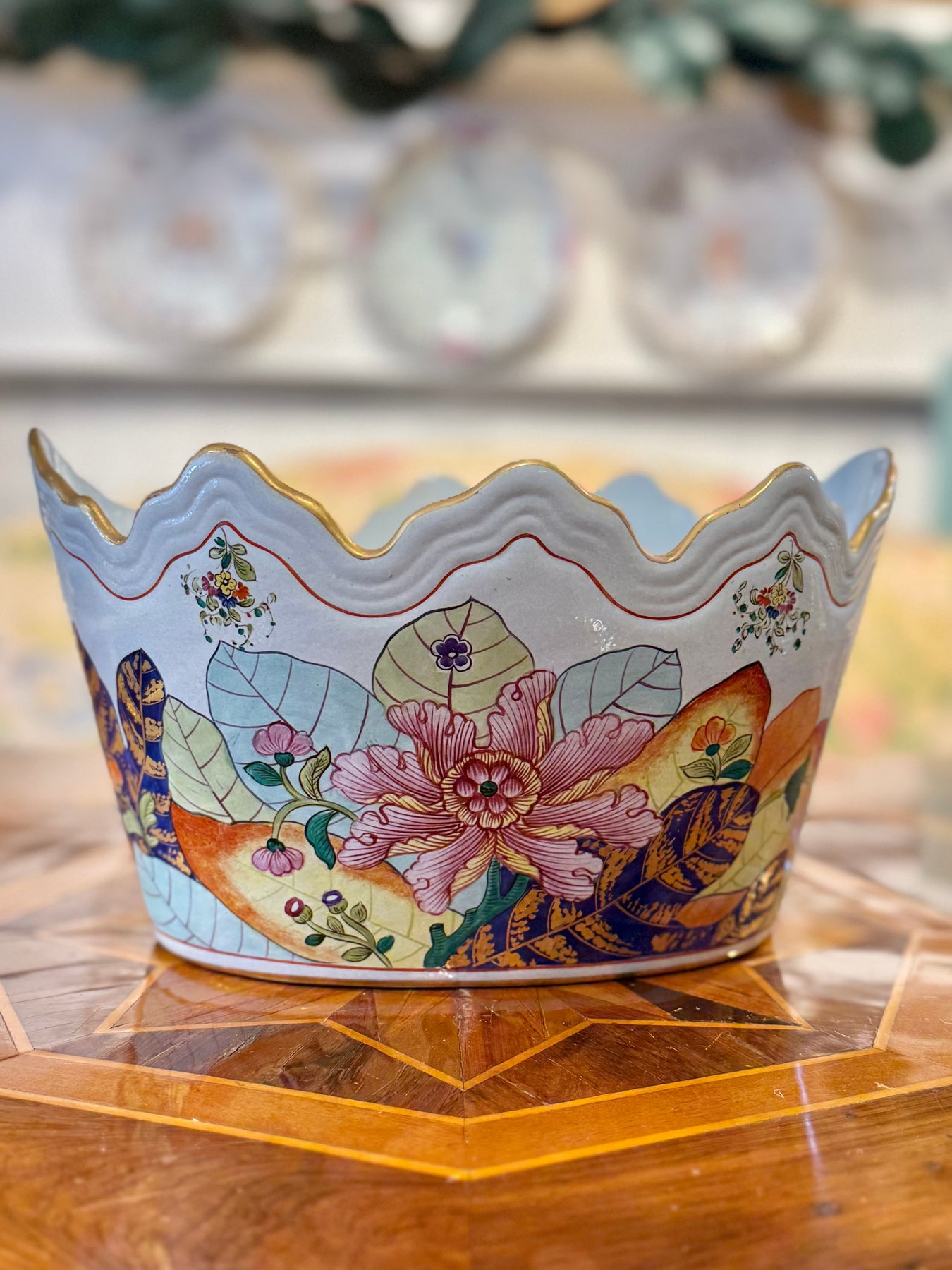A charming and decorative interpretation of historic English porcelain, this cachepot offers both visual impact and timeless appeal.