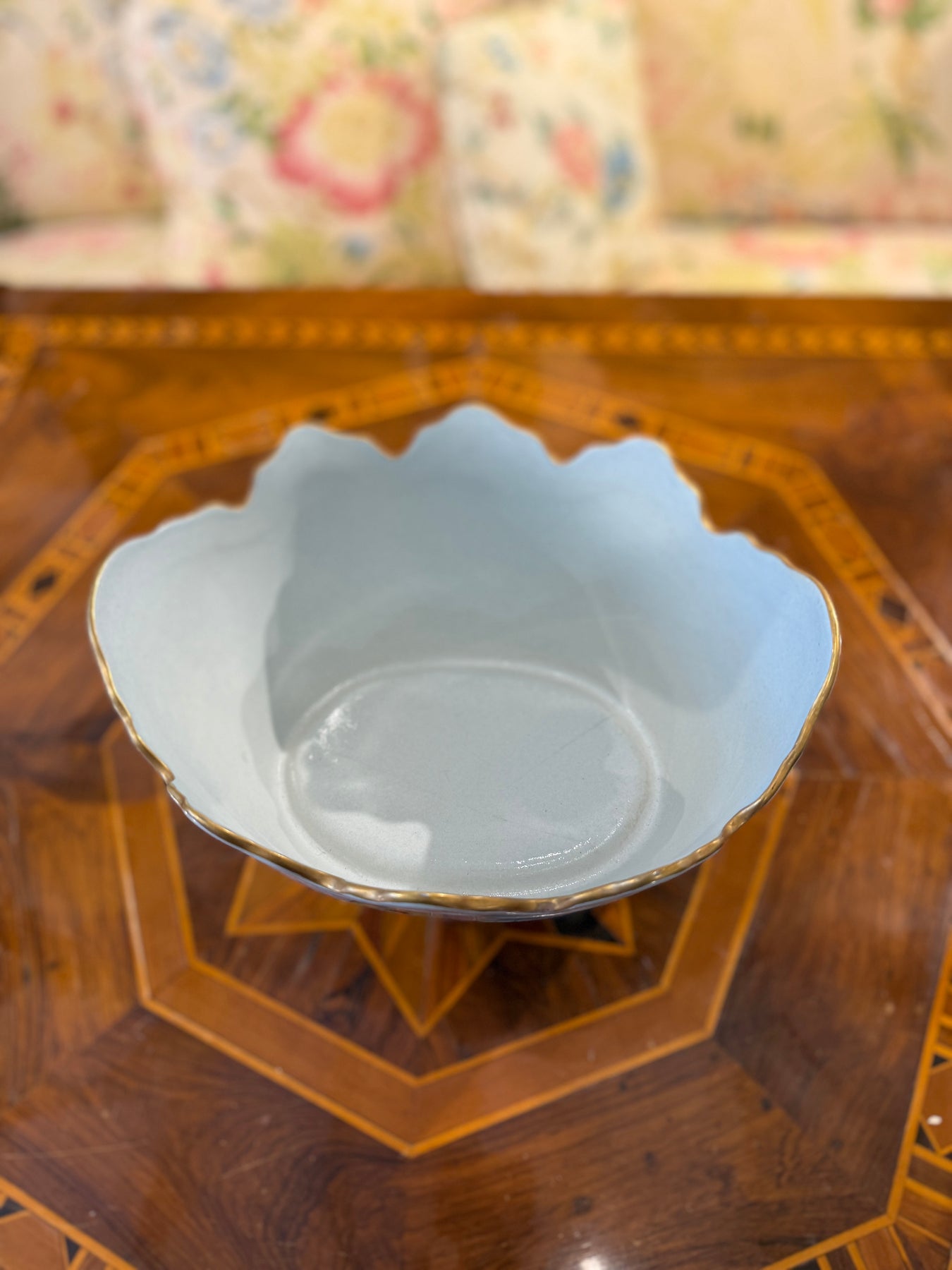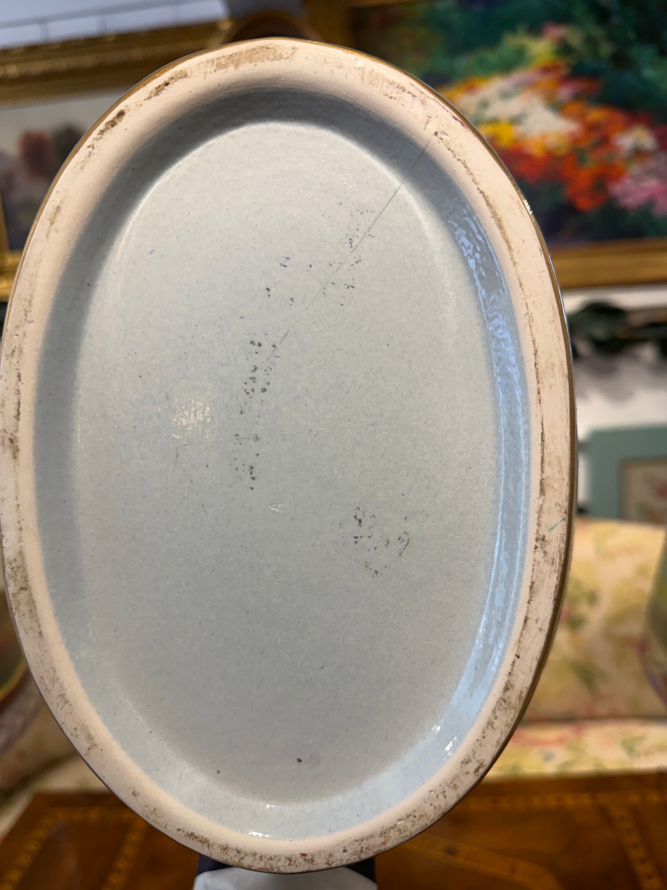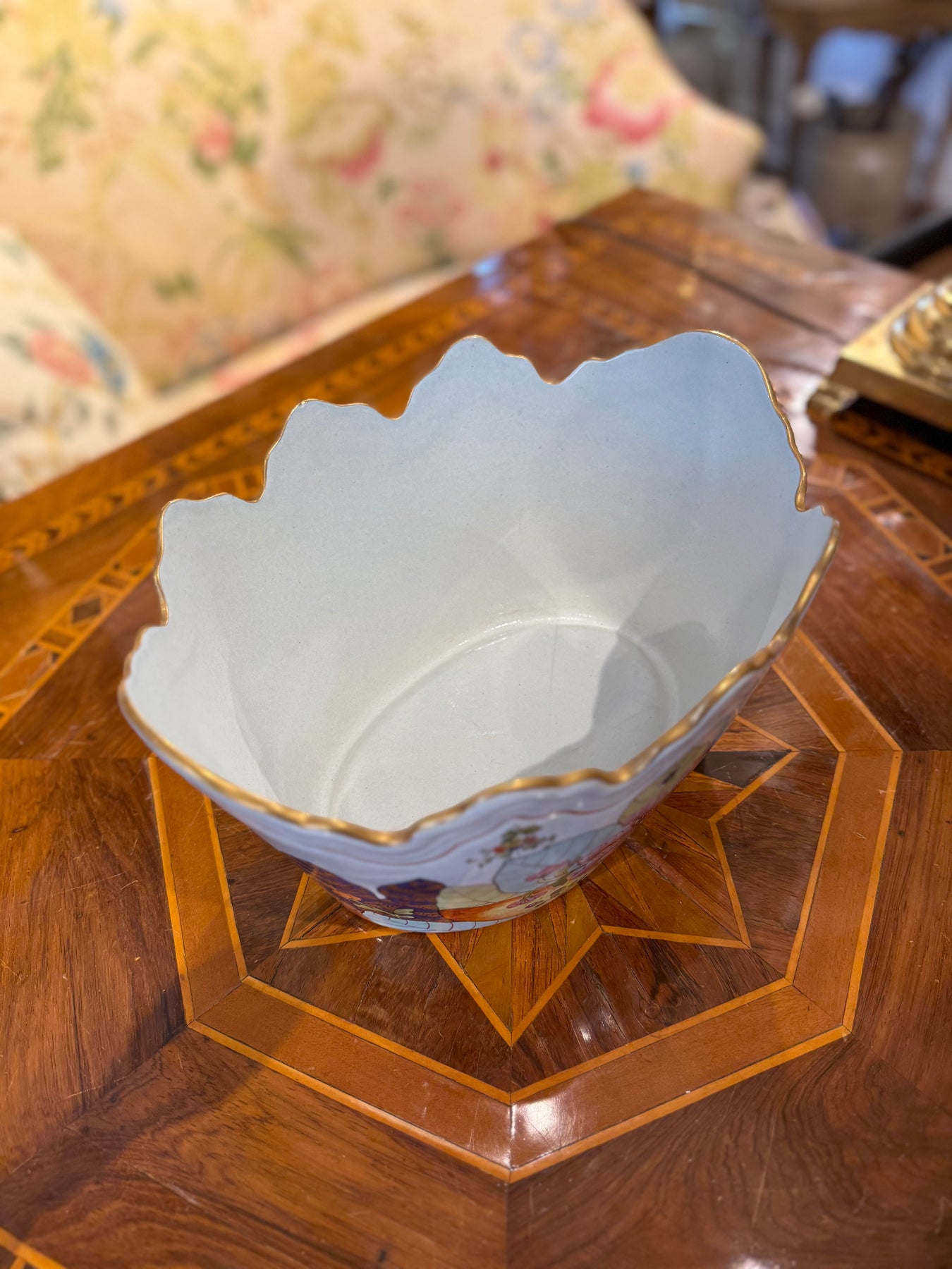 A beautifully detailed Lowestoft reproduction cachepot, created by Mottahedeh, a maker long admired for its faithful interpretations of historic porcelain and museum pieces. The original mark on the underside has been gently worn with time, but the form, decoration, and construction are consistent with Mottahedeh’s Lowestoft reproductions. The piece measures approximately 10.5 inches wide, 8.5 inches deep, and 6 inches high, offering a substantial presence that works equally well as a planter, centerpiece vessel, or decorative accent within a traditional interior.